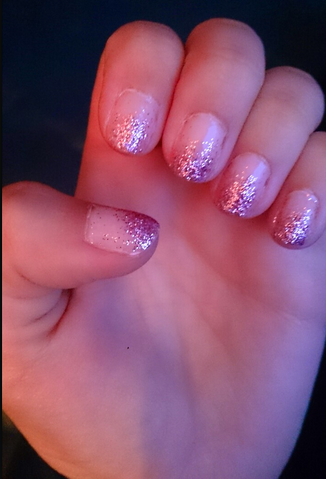On the theme of holidays and seasons, this last look is a classy twist on a classic. Again it’s got an ombre feel to it and is done in a similar way, using sponges and base nail polish. But this look is a little different. It’s perfect for a date night or special night out but the ideal place for this look would be Christmas or New Years Eve – the one time of year you can really SPARKLE!! Yes, yes, this look is special because it uses glitter.