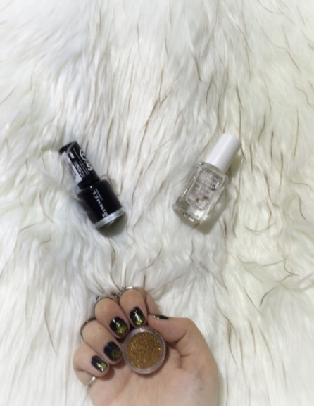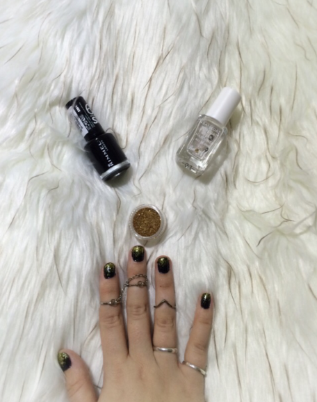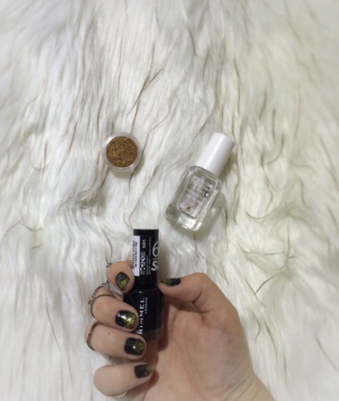 Once your black Rimmel polish has dried almost fully it’s time to grab your loose glitter and your base coat once again. I like to use just any old house hold sponge to apply the ombre – on a budget!  I apply a very thin layer of the base coat onto the mostly the bottom of my nail and a tiny bit going up towards the nail bed. Then I apply the base coat to the sponge, dip the sponge in the loose glitter and dab onto my nails. As this is an ombre look I dab more at the bottom and minimal at the top. This can take some practice but once you’ve got it down it’s the same every time!